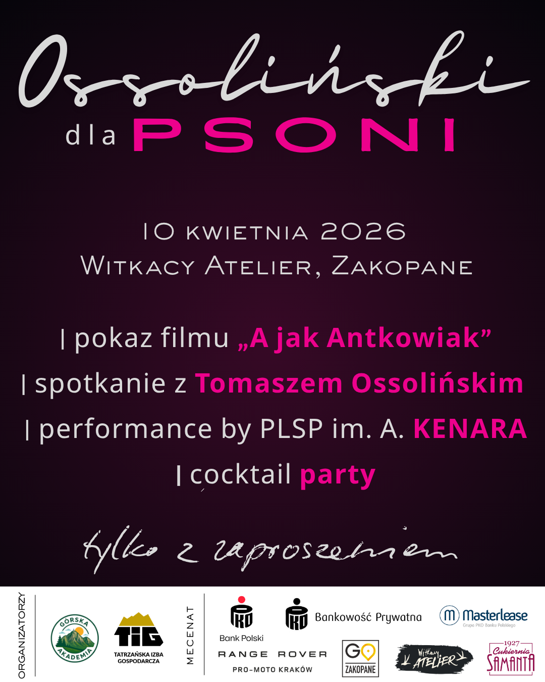 To spotkanie z Tomasz Ossoliński, połączone z pokazem filmu „A jak Antkowiak” oraz rozmową Q&A, którą poprowadzi Katarzyna Montgomery. W programie także artystyczny performance by PLSP im. A. Kenara, recital i cocktail party.